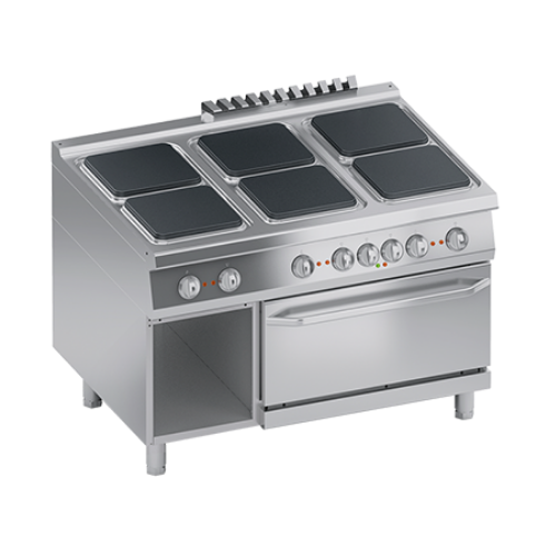 Încălzire obținută prin plăci electrice pătrate din fontă . Elemente de încălzire fixate pe fundul plăcii, încorporate într-un strat de material izolant. Fiecare plită este prevăzută cu un selector, care permite variația puterii de căldură de la maxim la minim în șapte poziții . Siguranță asigurată de un comutator de limită de temperatură situat în interiorul plitei.