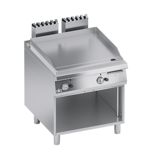 Arzător unic în formă de U cu combustie optimizată și robinet cu gaz de siguranță cu termocuplu și flacără pilot; permite reglarea flăcării de la maxim la minim. 2 plăci de lucru independente cu lățimea de 800 mm.